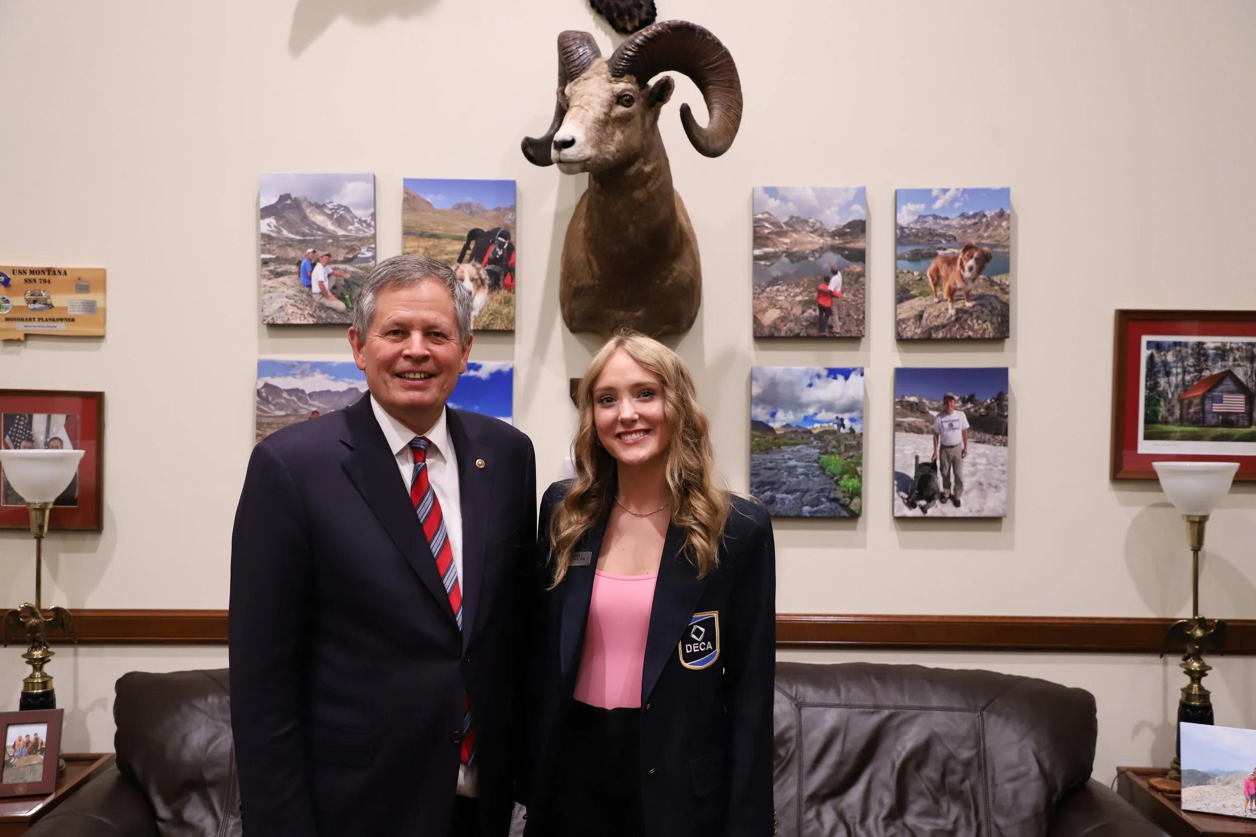 GHS DECA state officer Bailey Kumlien meets with Senator Steve Daines. Photo provided by Bailey Kumlien.